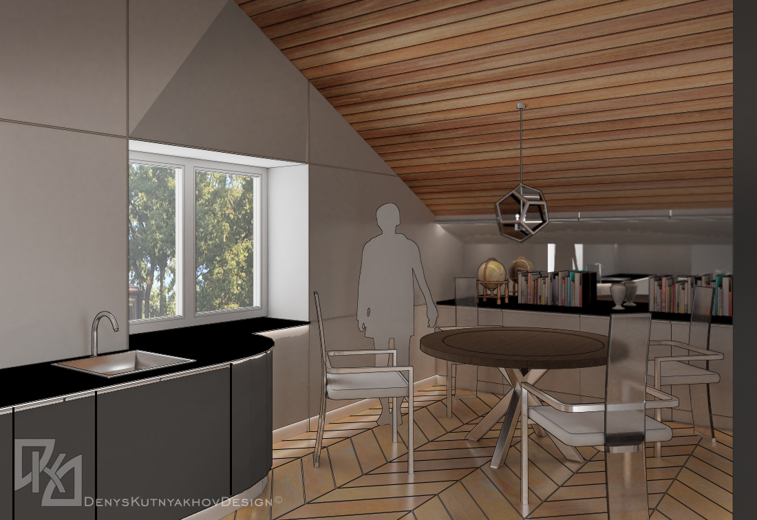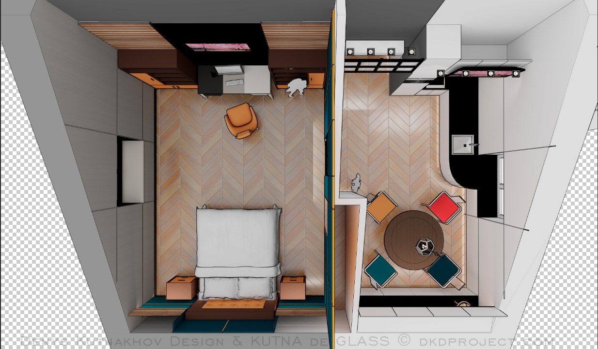 Квартира спроектована як простір для натхнення: відкритий планувальний принцип дозволяє вільно поєднувати житлові та робочі зони, а арт-елементи в декорі додають індивідуальності.