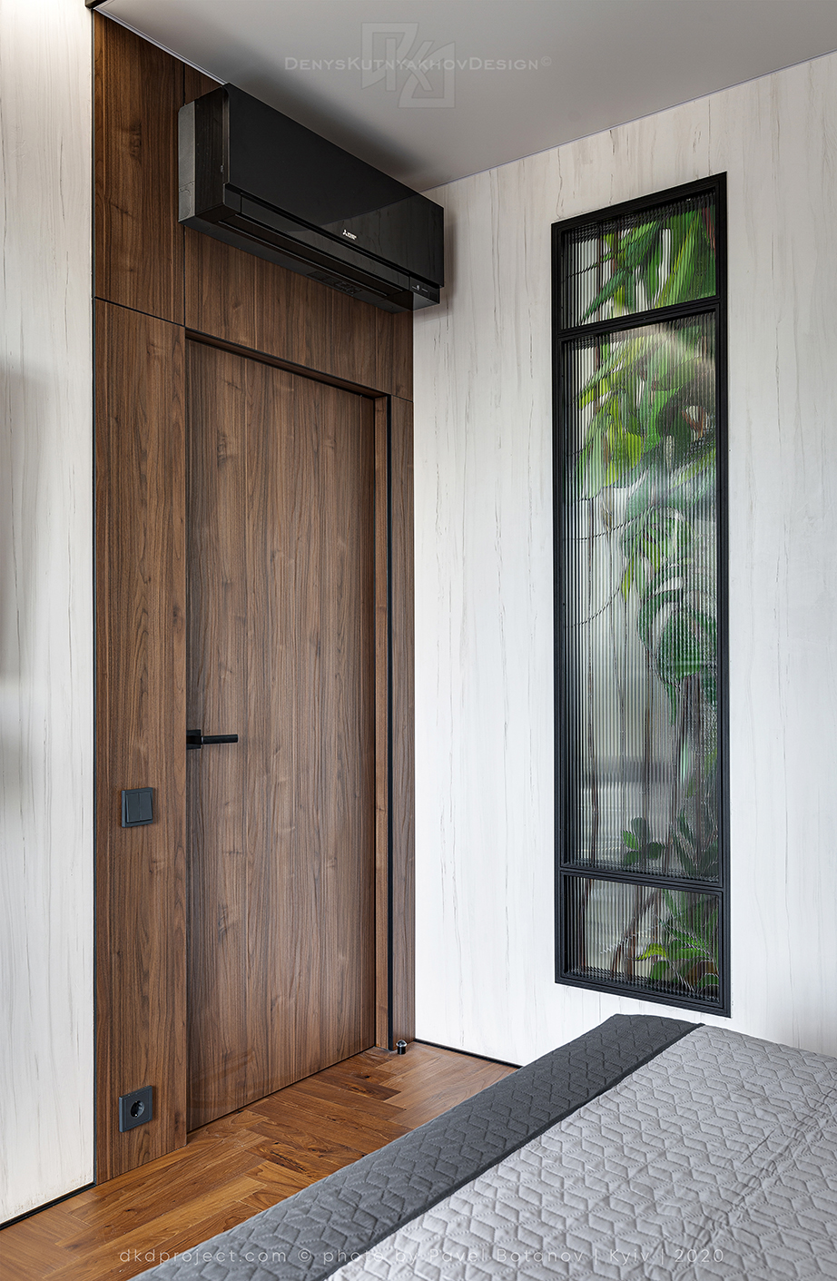 Спальня передає настрій та врівноважений характер свого володаря. Абсолютно нові у використанні художні прийоми різно-фактурного та кольорового скла дозволили створити артистичний та атмосферний інтер’єр, трьох-вимірне вітражне вікно "Jungle": вдень воно пропускає світло із фасадних вікон спальні до ванної кімнати, а у вечірній час служить декоративним 3D-панно, яке пропускає у спальню тепле світло крізь вітраж, розроблений Дениcом Кутняховим і виконаний майстрами студії KUTENGLASS concept. Здатність вітражного скла розсіювати світло, а не поглинати, дозволяє створювати в інтер'єрі незвичайні світло колірні рішення.