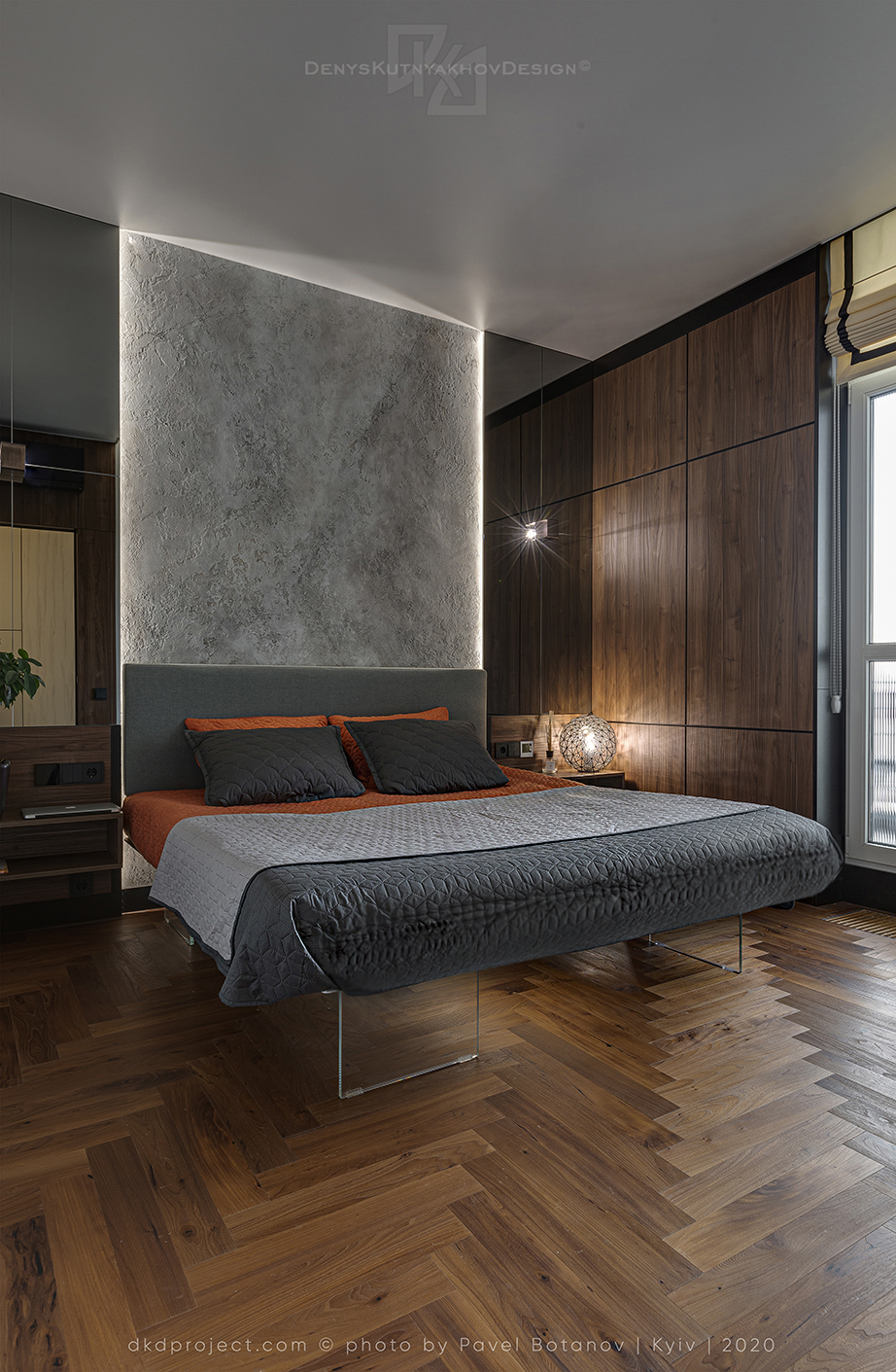 Акцентним є ліжко відомого італійського бренду LAGO: стоячи на скляних ніжках і маючи нижню LED-підсвідку, воно, ніби парить у просторі. Тонка межа між естетики та функціоналу.
